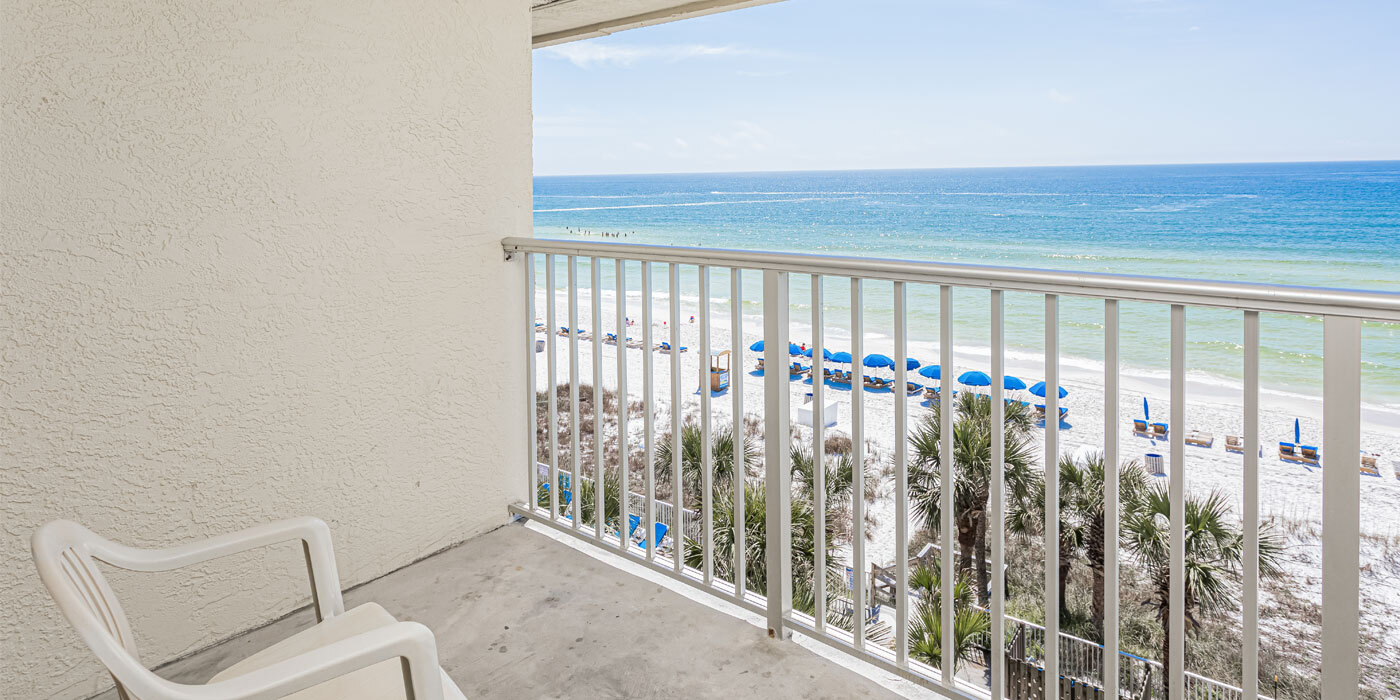 Ledge glass balcony overlooking beachfront pool